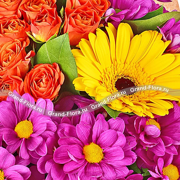 Аккуратный и стильный букет непременно вызовет восхищение своего счастливого обладателя. Сочетание оранжевых кустовых роз и фиолетовой хризантемы на фоне крупных цветков желтой герберы подчёркнуто насыщенно-зелёными листьями салала. Совершенство можно подарить, когда оно воплощено в цветах.